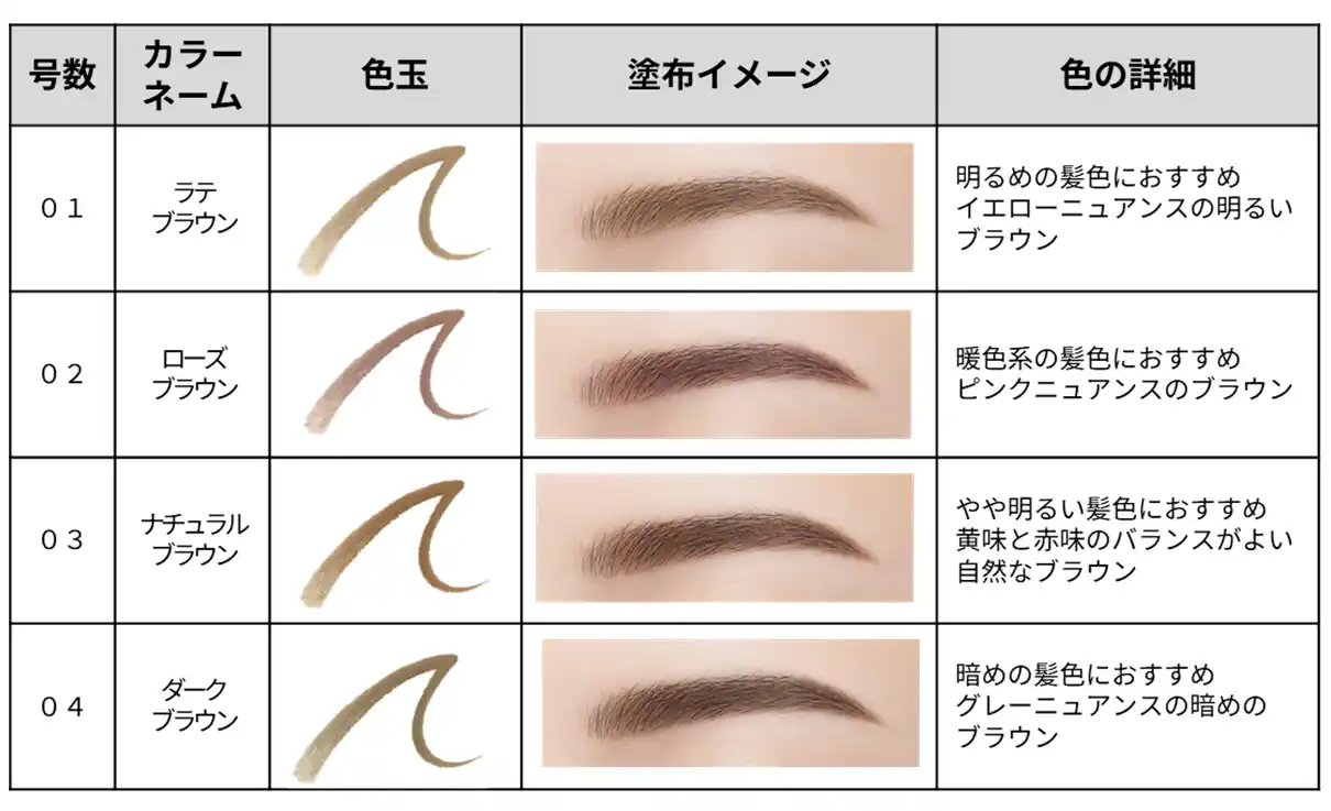 (左から)01 ラテブラウン/02 ローズブラウン/03 ナチュラルブラウン/04 ダークブラウン |
