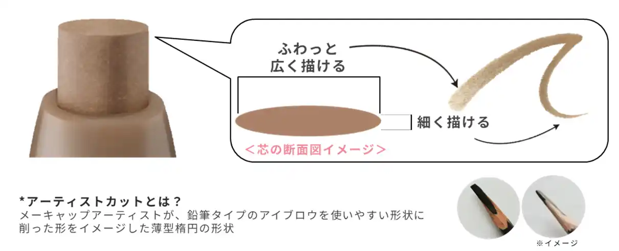 描きやすさを追求した薄型楕円の“アーティストカット芯”は、幅広い面でふんわり、細い面で眉尻をすっきりと描ける多機能形状。1本で眉全体のニュアンスを自在にコントロールできます。 |