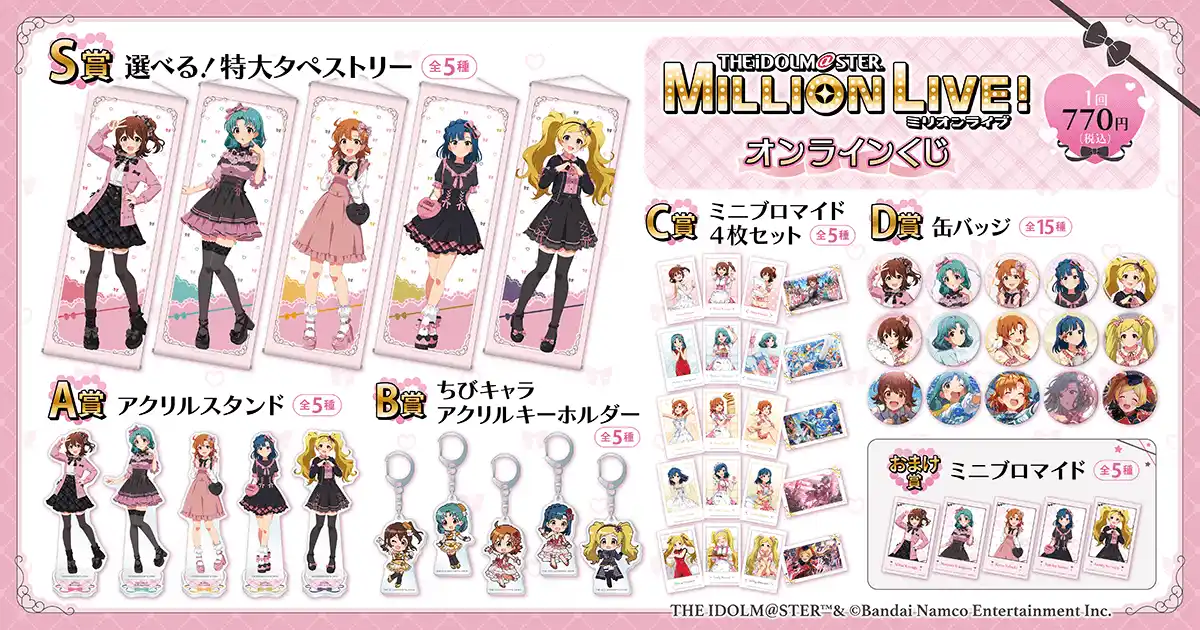 株式会社KADOKAWA(本社:東京都千代田区、取締役 代表執行役社長 CEO:夏野 剛、以下 KADOKAWA)は、運営するオンラインくじサービス「くじ引き堂」において、『アイドルマスター ミリオンライブ!』のオリジナル商品が手に入る<アイドルマスター ミリオンライブ! オンラインくじ>を、2026年4月9日(木)12時より販売します。