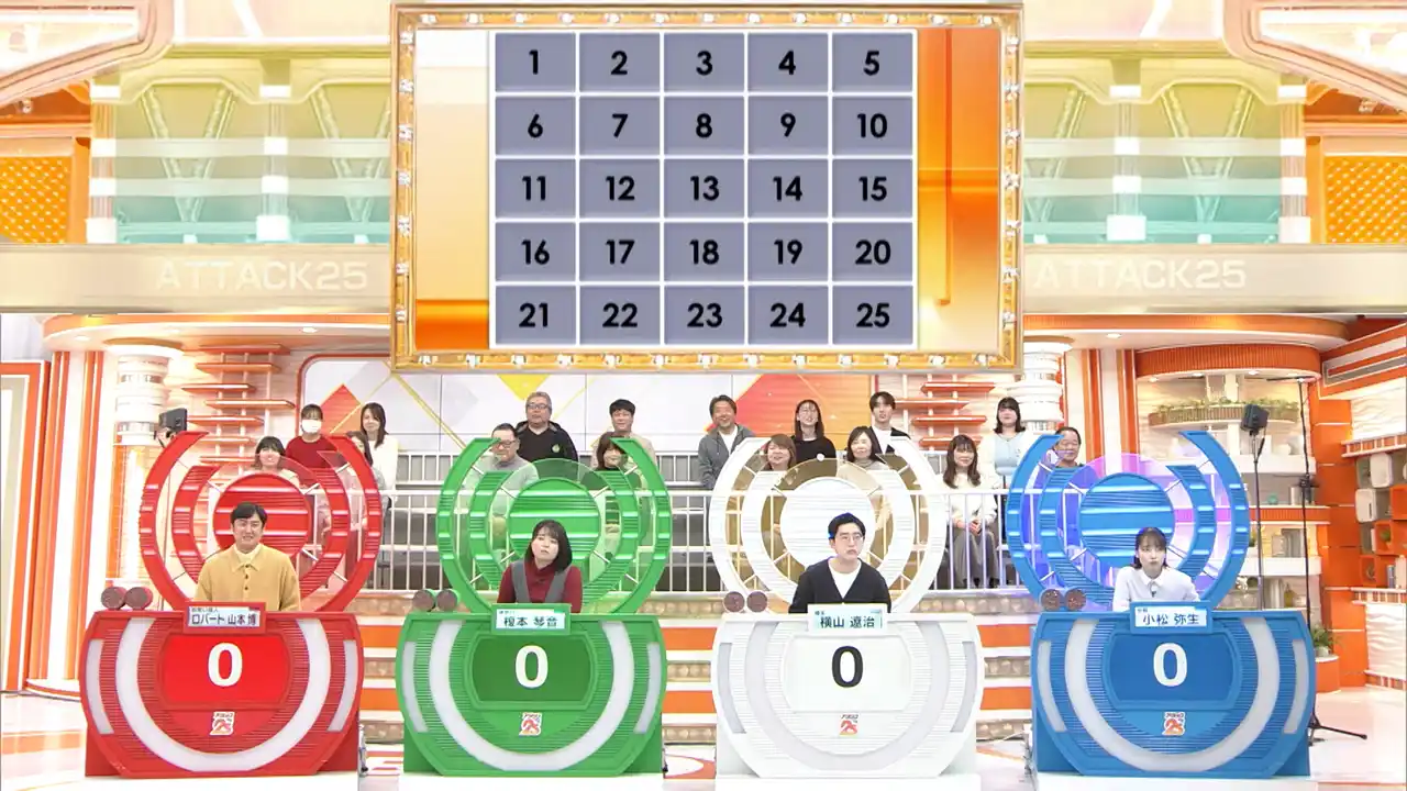 これまでは原則として一般出場者4名での大会をお届けてしてまいりましたが、放送開始51年を迎えた本タイミングで出場枠を変更し、赤・緑・白・青と4色ある解答席のうち赤の席を「ゲスト解答席」に設定、毎回大会に関連する芸能人・有名人が登場します。予選を勝ち抜いてきた出場者に、芸能人はどう立ち向かうのか!?新たな歴史を刻むアタック25にぜひご注目ください。 |