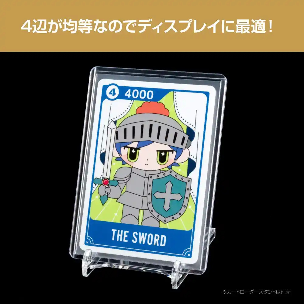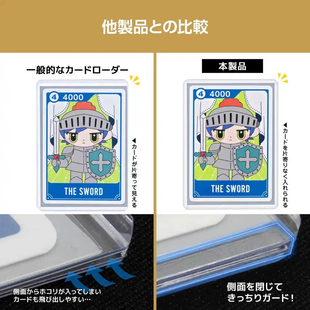 本製品は、上下左右すべてのフレームが閉じる構造を採用したサイドローダーです。スリーブに入れたカードを専用のフタ付き収納トレイに載せて横から差し込むだけで、四辺が均等に閉じた硬質ローダーとして保護できます。 |