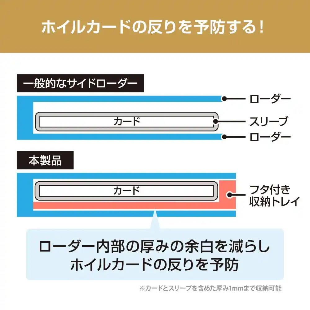 また、トレイを差し込むことで内部の余白を圧縮し、カードの反りを軽減する効果もあります。開口部を閉じられるため、保管や持ち運び、郵送時のカード飛び出し事故を防ぎやすく、コレクションの保護に適したローダーです。 |