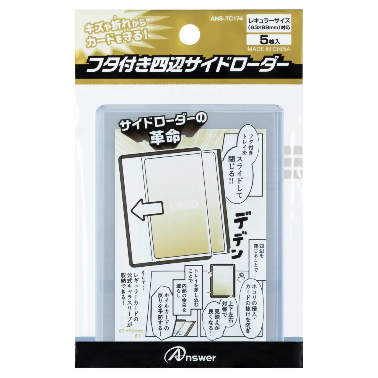 ゲーム周辺機器・トレカサプライメーカーのアンサー株式会社(本社:大阪府大阪市中央区、代表取締役社長:有村 勇志)は、上下左右の四辺を閉じる!公式キャラクタースリーブも収納可能でホイルカードの反りを予防!「レギュラーカード用 フタ付き四辺サイドローダー」を、公式アンサーストア、全国の家電量販店、小売店、専門店、インターネットショップ等にて6月下旬より販売を開始することをお知らせいたします。また、本日より公式アンサーストアにて先行予約を受付開始いたします。 |