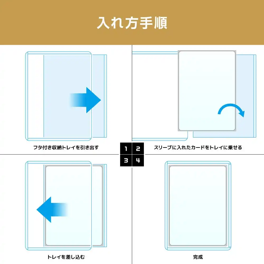 サイドローダーからフタ付き収納トレイを取り出し、スリーブに入れたカードをトレイに載せます。その状態でそっとトレイをローダーに差し込むことで、四辺が閉じられたサイドローダーが完成します。 |