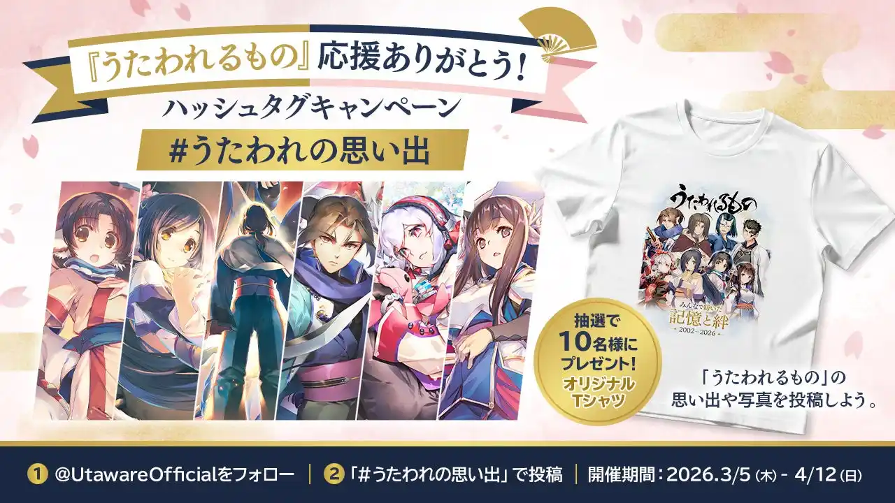 | 『うたわれるもの』公式X(旧Twitter)では、『うたわれるもの 白への道標』発売記念として、2026年3月5日(木)より「うたわれるもの」シリーズの思い出を投稿していただくハッシュタグキャンペーンを開催いたします。ハッシュタグ「#うたわれの思い出」をつけて、「うたわれるもの」シリーズの思い出や写真などを投稿していただいた方の中から、「うたわれるもの」応援ありがとう!オリジナルTシャツを合計10名の方にプレゼントいたします。 | |||||||||||||||||||||||