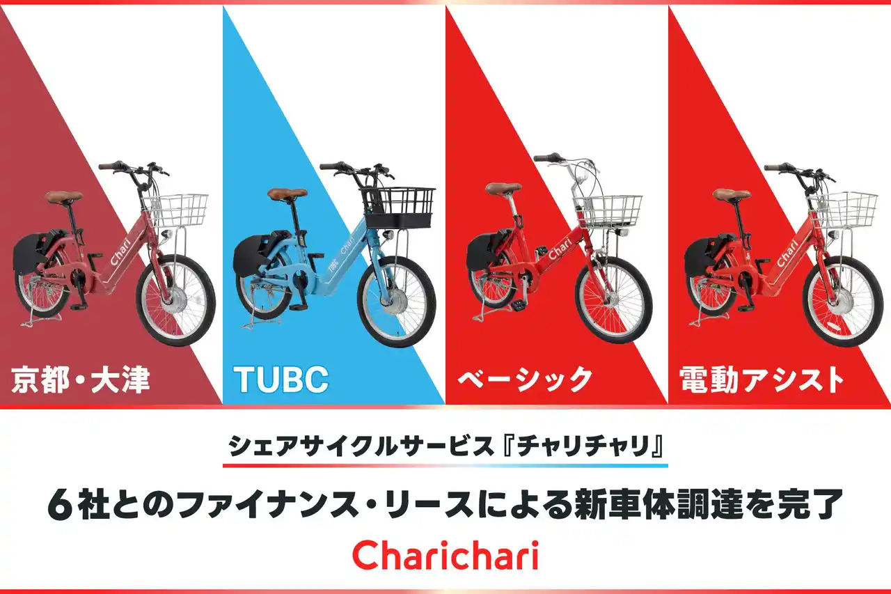 シェアサイクルサービス『チャリチャリ』を運営するチャリチャリ株式会社(本社:福岡市中央区、代表取締役:家本 賢太郎、以下「チャリチャリ」)は、2026年2月~3月において、株式会社九州リースサービス、佐銀リース株式会社、ひろぎんリース株式会社、りそなリース株式会社、FFGリース株式会社、MUFGファイナンス&リーシング株式会社の6社と連携し、京都・大津エリアの本格展開や既存エリアの需要増加に対応するため、ファイナンス・リース(以下「リース」)による新車体調達を実施いたしました。なお、ひろぎんリース株式会社、FFGリース株式会社、MUFGファイナンス&リーシング株式会社の3社とは今回新たに取り組みを開始しました。