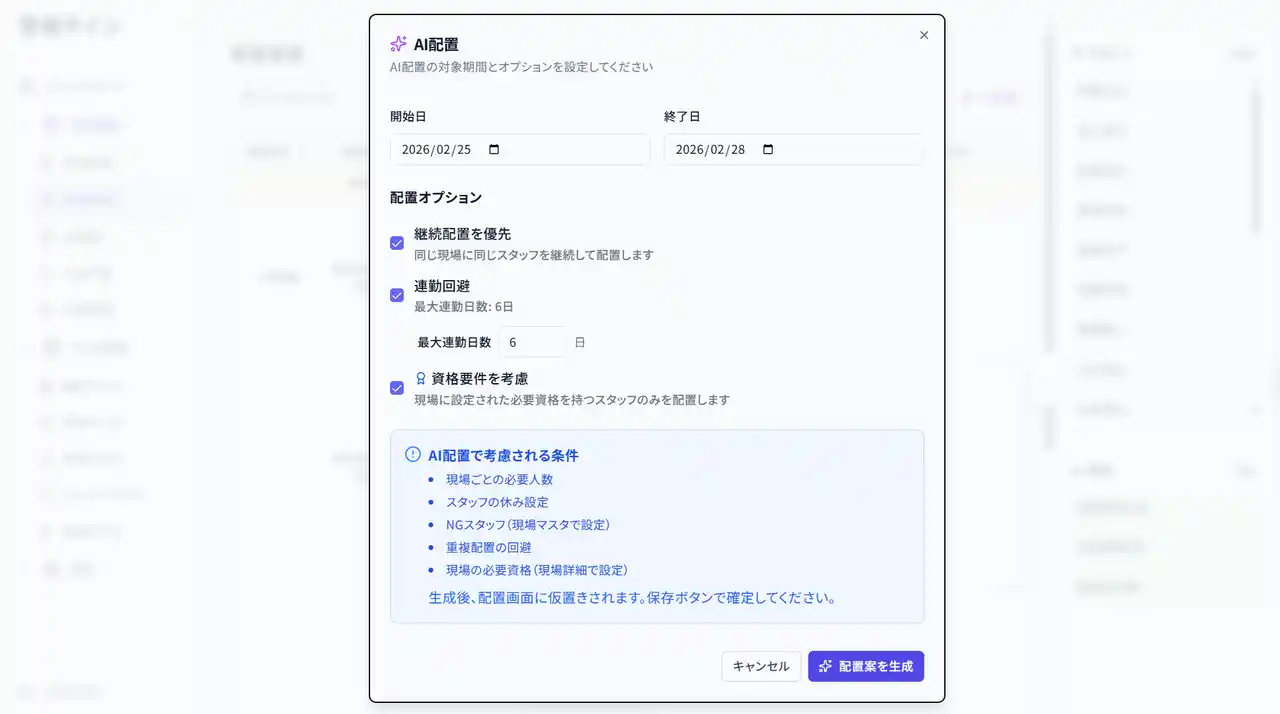 隊員の資格・休日希望・現場の必要人数・連続勤務制限をAIが自動で考慮し、最適な配置案を作成。管理者は確認・微調整するだけで済みます。 |