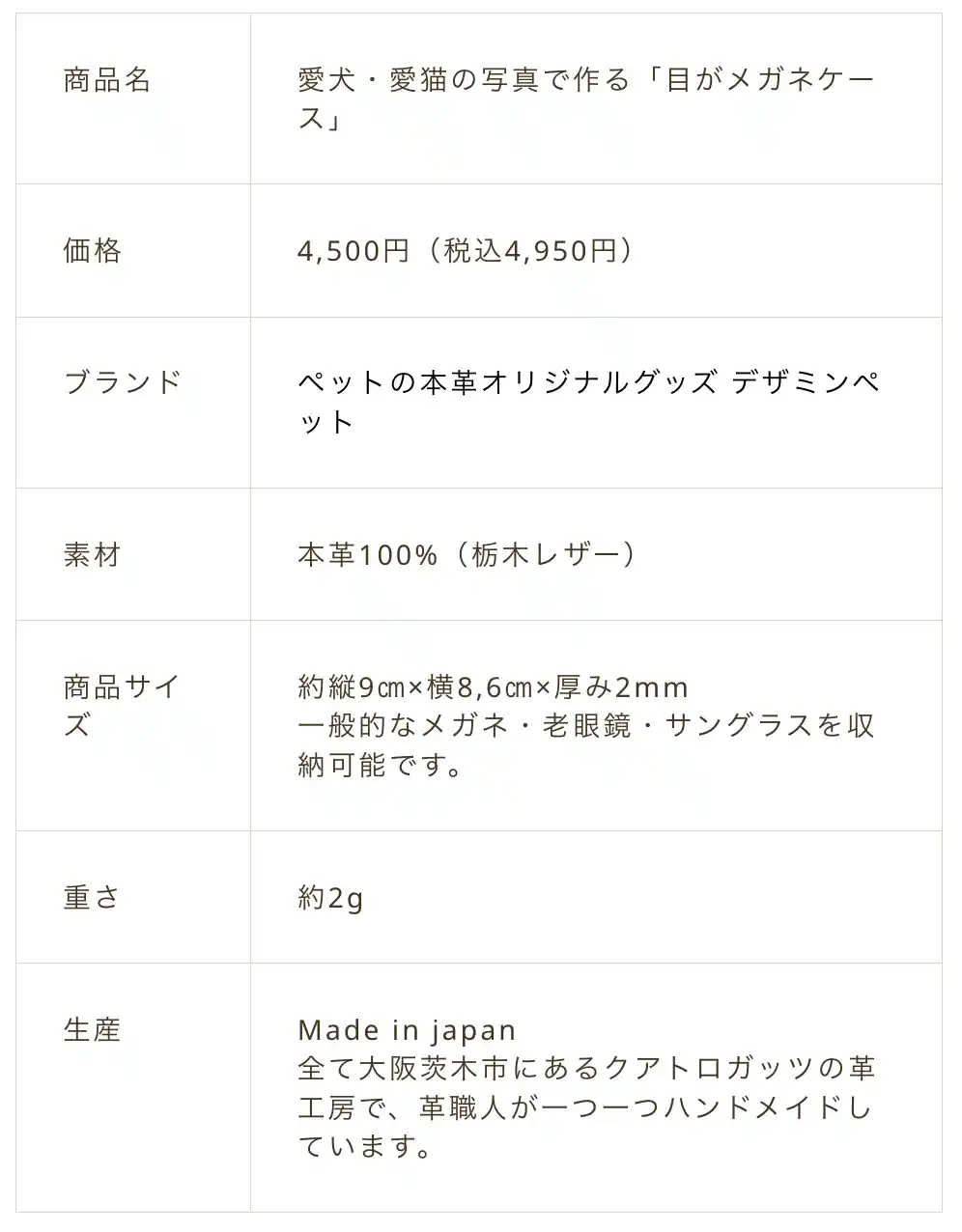大阪府茨木市で革小物の製作・販売を行う株式会社ガッツ(代表:中辻大也)は、愛犬・愛猫の写真から“目”をデザインした「目がメガネケース」を発売しました。価格は4,500円(税込4,950円)。母の日ギフト向け商品として展開し、4月1日~4月15日まで「母の日お届けプラン」の早割キャンペーンを実施、期間中は追加料金1,000円が無料となります。 詳細はこちら https://pet.dezamin.com/dog_and_cat_motherday/