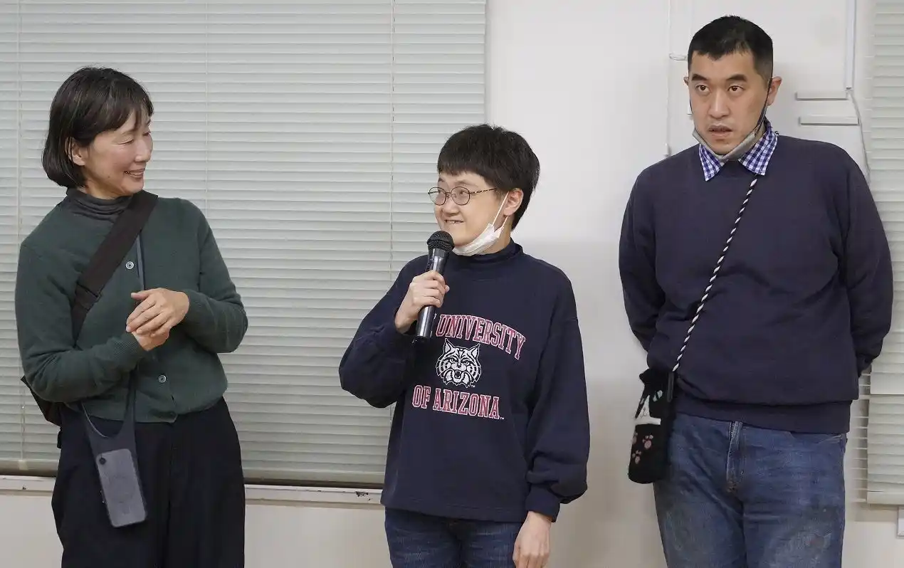 ▲魚住さん(左)と動物を描くのが好きな三好さん(中央)と立体作品が得意な平本さん(右) |
