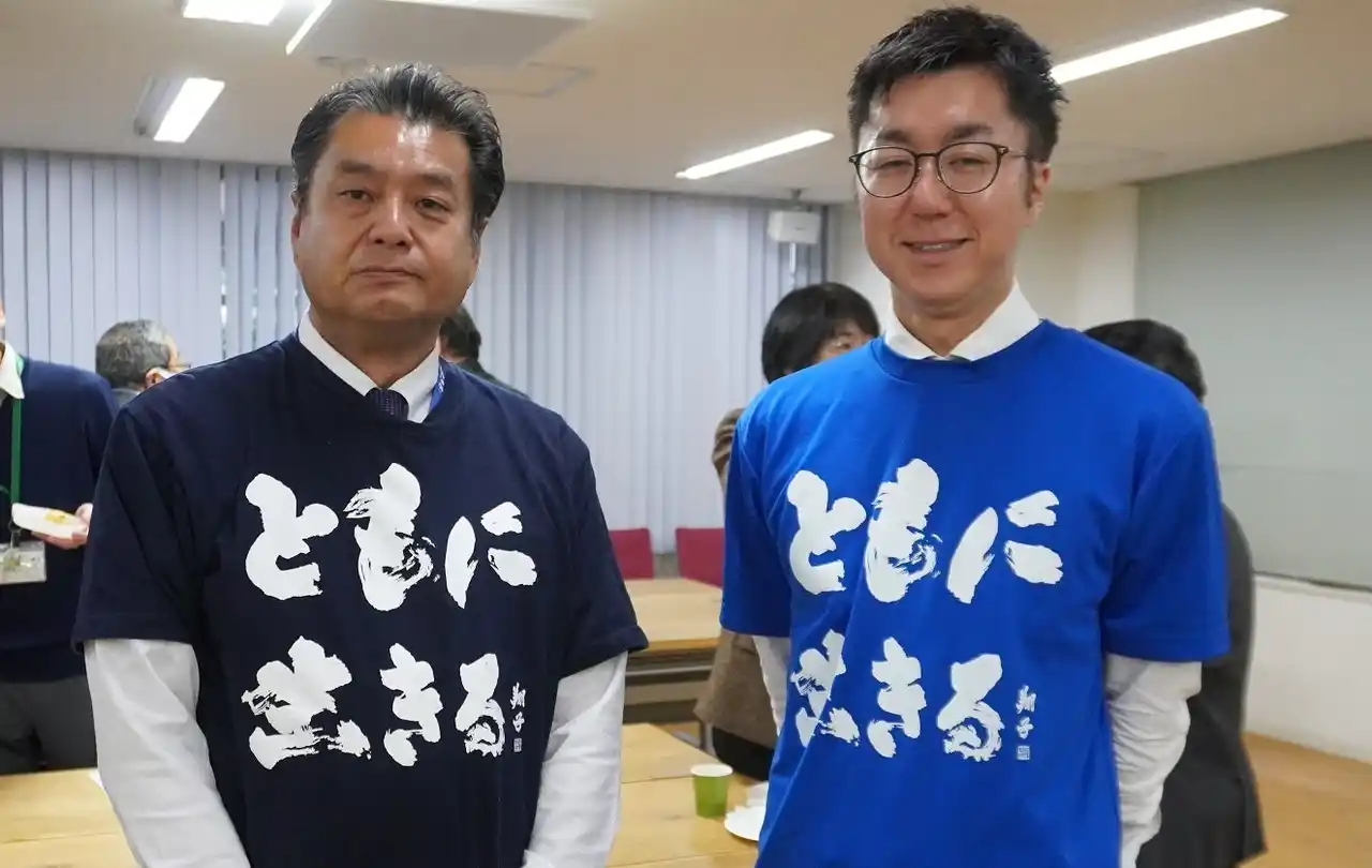 ▲やまゆり事件を機に制定された憲章Tシャツで参加した大野さん(左)と同局の松本勇哉さん(右) |