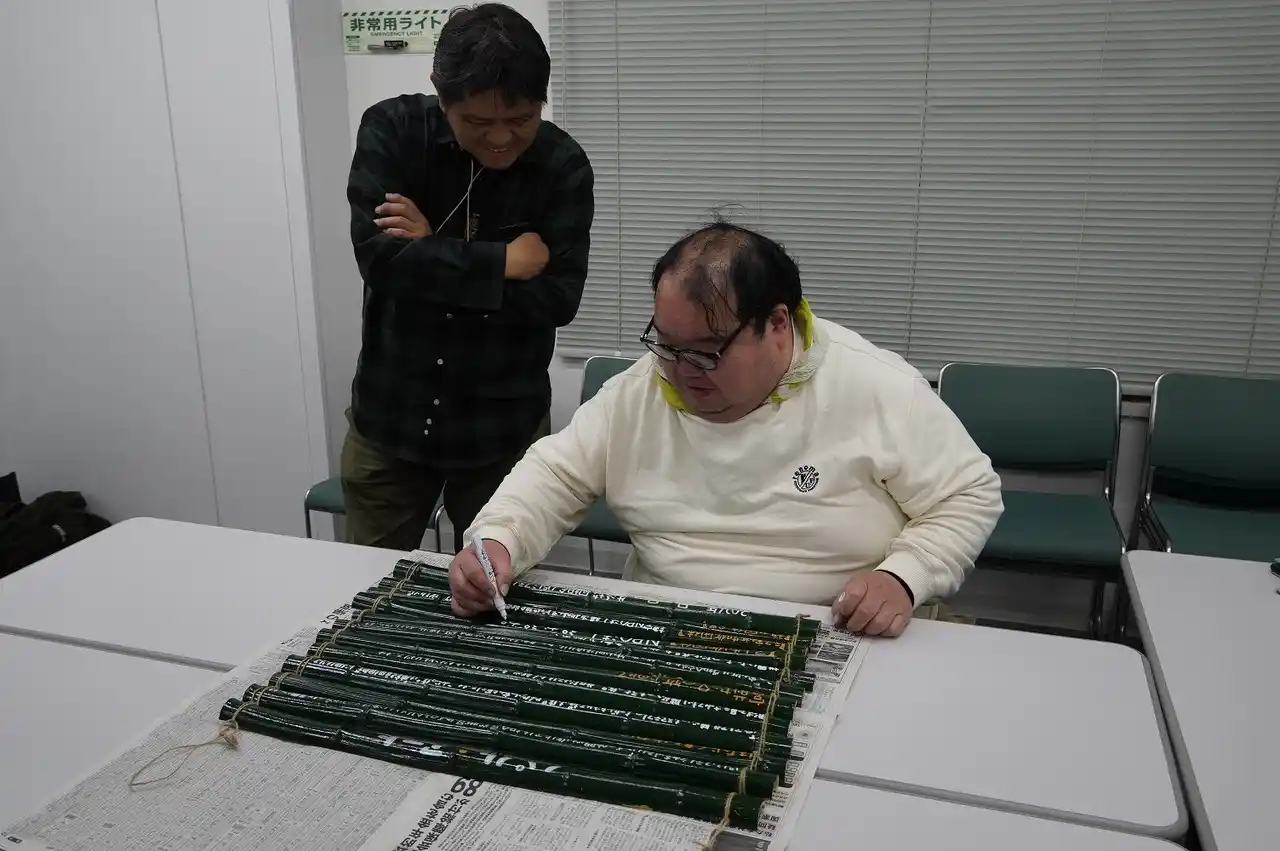 各拠点のアート作品を紹介する看板は、NPO法人横浜移動サービス協議会(横浜市中区長者町、服部一弘理事長)が運営する就労継続支援B型事業所 IKIIKIカンパニー(横浜市中区長者町)の竹千代丸さんが制作しました。最後の一筆は、披露目会直前に会場で仕上げ「4会場分の看板の竹を鉈(なた)で割って手が痛くなり、決まった幅に文章を収めるなど苦労しました。何とか間に合い完成しました」と作業の苦労を語りました。 |