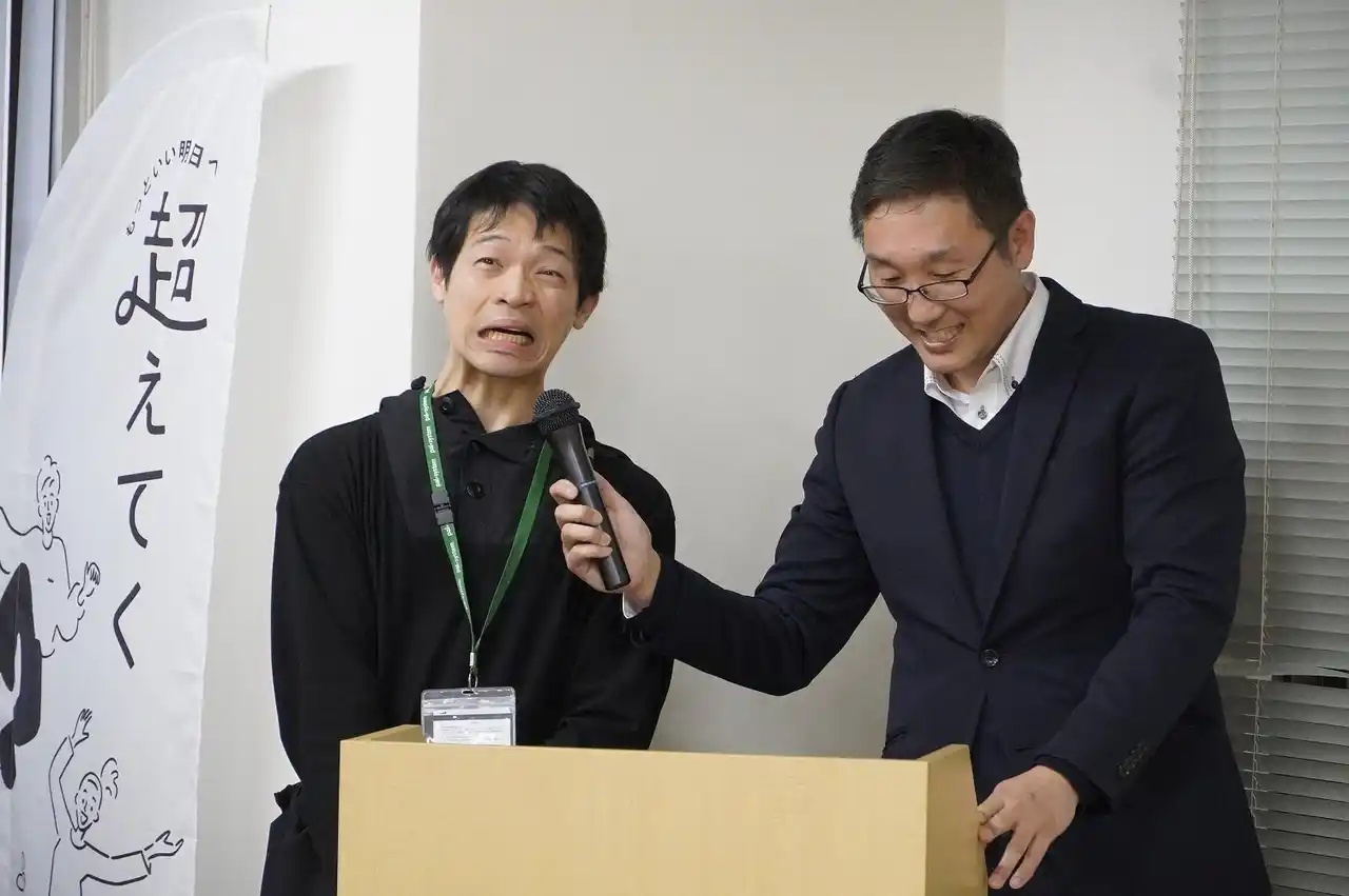 披露目会には、神奈川県福祉子どもみらい局やアーティストの所属団体、パルシステム神奈川の役職員などが駆け付けました。司会の採用育成課の坂井洋介職員と朝倉和男課長は冒頭、パルシステム神奈川の2030年ビジョン「だれもが認めあい、ともにいきる地域づくり」実現に向けた活動の一環として、県の助言も受け障害のある人が活躍する場づくりのため「パル・アート」展示を開始する経緯を紹介しました。 |