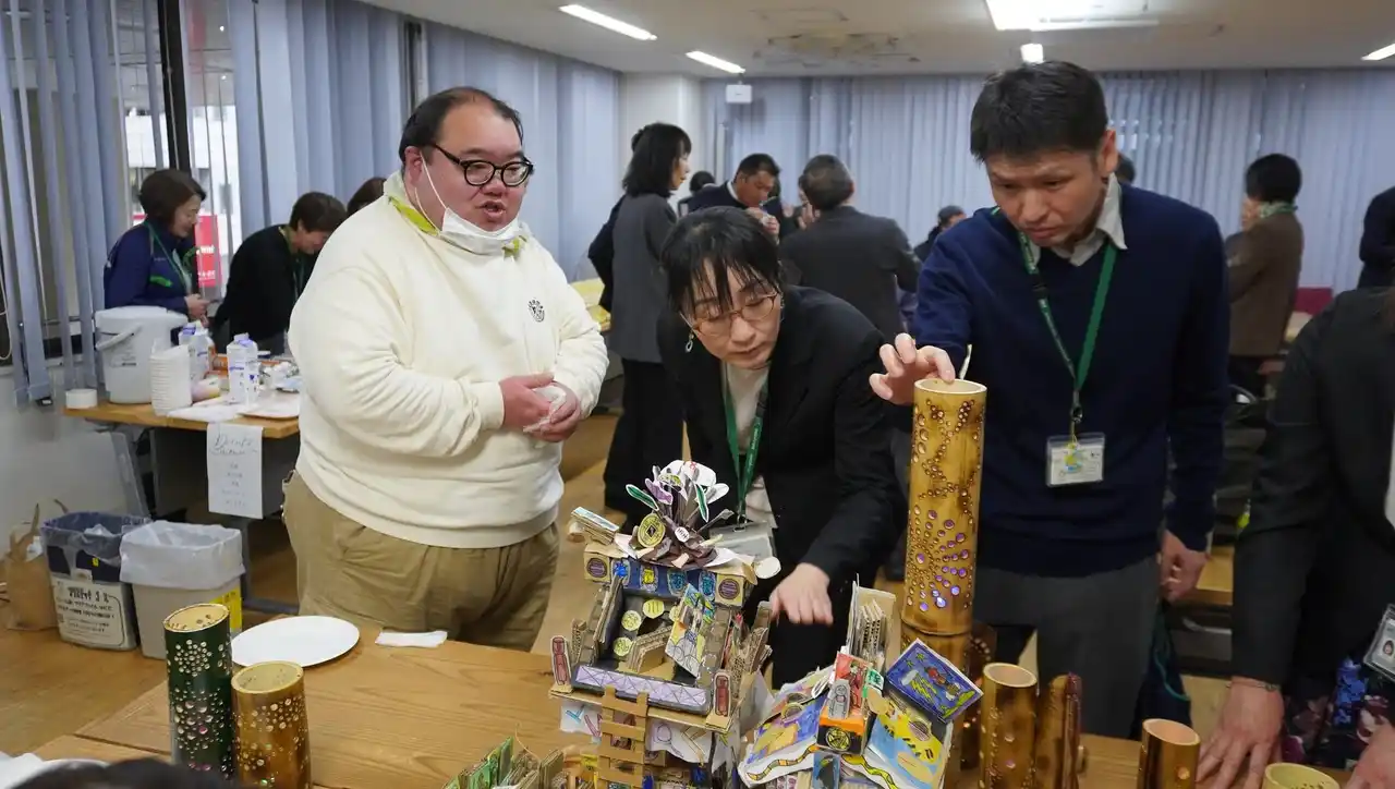 ▲竹あかり制作の工夫を伝える竹千代丸さん(左端) |