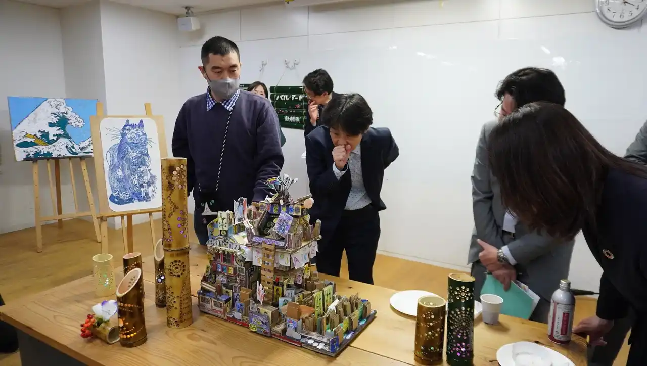 会場では、NPO法人ぷかぷかが製造したパンや菓子が振る舞われ、参加者が共に味わいながらアート作品を鑑賞しました。会場のテーブルには竹千代丸さんはじめIKIIKIカンパニーの利用者が制作した「竹あかり」などの竹製品を飾り、専用の工具を用いて仕上げる工夫などが紹介されました。平本さんも詳細な工夫が施された立体作品のこだわり一つひとつを参加者に説明しました。 |