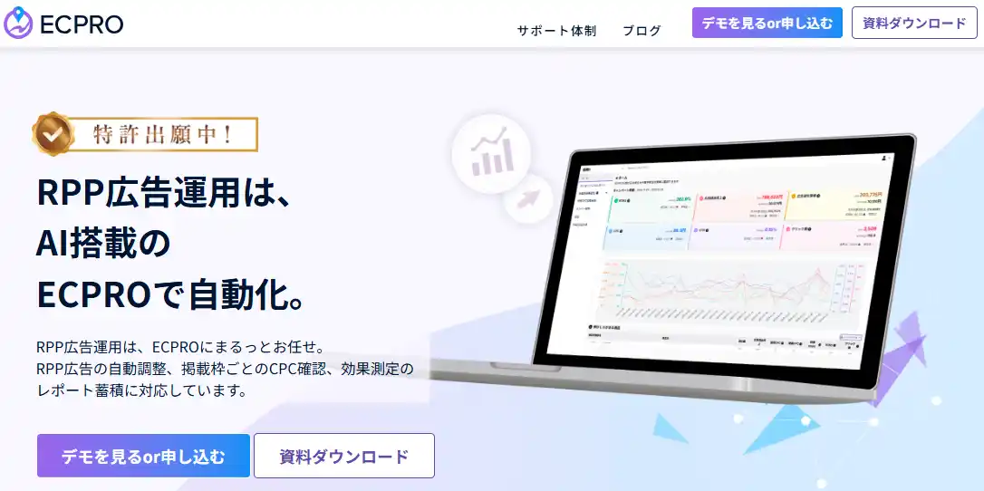 ECPRO(https://ecpro.ai/)は、楽天市場RPP広告の入札単価を自動調整するSaaSツールです。広告データの一元管理と自動入札機能により、店舗運営者の広告運用工数を大幅に削減します。 |