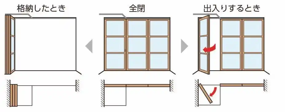 間仕切「プレイス」移動収納は、使用シーンに応じて空間を柔軟に切り替えられる設計としています。全閉時にはパネル同士がフラットに収まり、壁のようにしっかりと空間を仕切ることが可能です。一方、使用しない際にはパネルをコンパクトに収納できるため、空間をフレキシブルに活用できます。 |