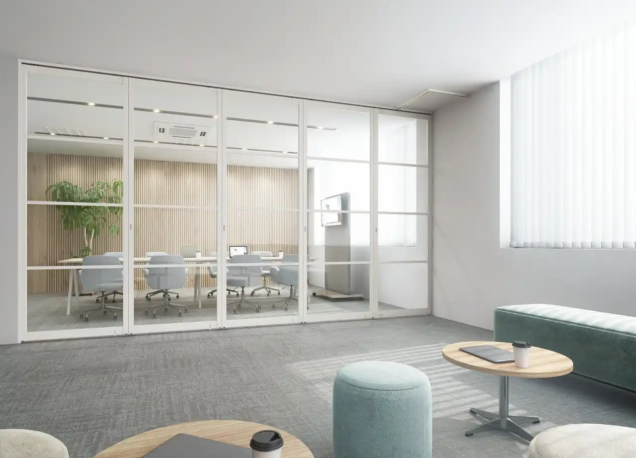 また、出入りは収納側に設けたパネルから行う構造とすることで、動線を確保しながら利用時の利便性向上に寄与します。さらに、最大幅9.6m、高さ3mまで対応可能な設計で、中~大規模空間におけるゾーニングにも対応し、オフィスの会議室分割や店舗・カフェにおける貸切スペースの創出、イベント時の一時的な区画分けなど、多様なニーズに応えます。 |