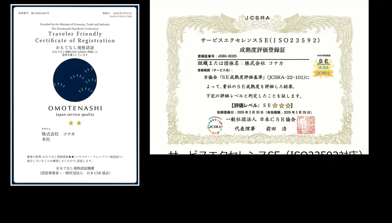 | 「おもてなし規格認証」は初取得の2018年以来3回目の認定更新、「サービスエクセレンスSE成熟度評価」は初取得の2023年以来はじめて認定更新となります。 | |||