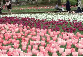 チューリップ、スイセンなどの春咲き球根を混ぜてランダムにちりばめた「球根ミックス花壇」でもチューリップが見頃です。 |
