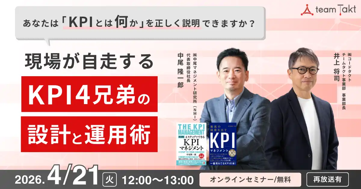 株式会社コードタクト(本社:東京都渋谷区、代表取締役CEO:後藤正樹)は、2026年4月21日(火)に、リクルートグループや数々の企業で組織変革を牽引してきたKPIマネジメントの第一人者・中尾隆一郎氏を招聘し、オンラインセミナー「現場が自走するKPI4兄弟の設計と運用術」を開催します。