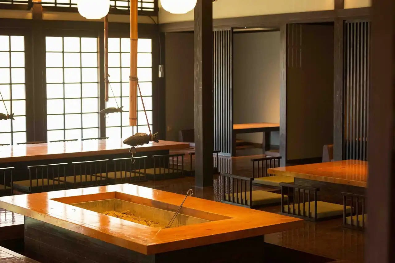 古民家を思わせる梁の高い天井と存在感のある囲炉裏が迎える食事スペース。「発酵」をテーマに、心と身体を整えるお料理を提供します。 |