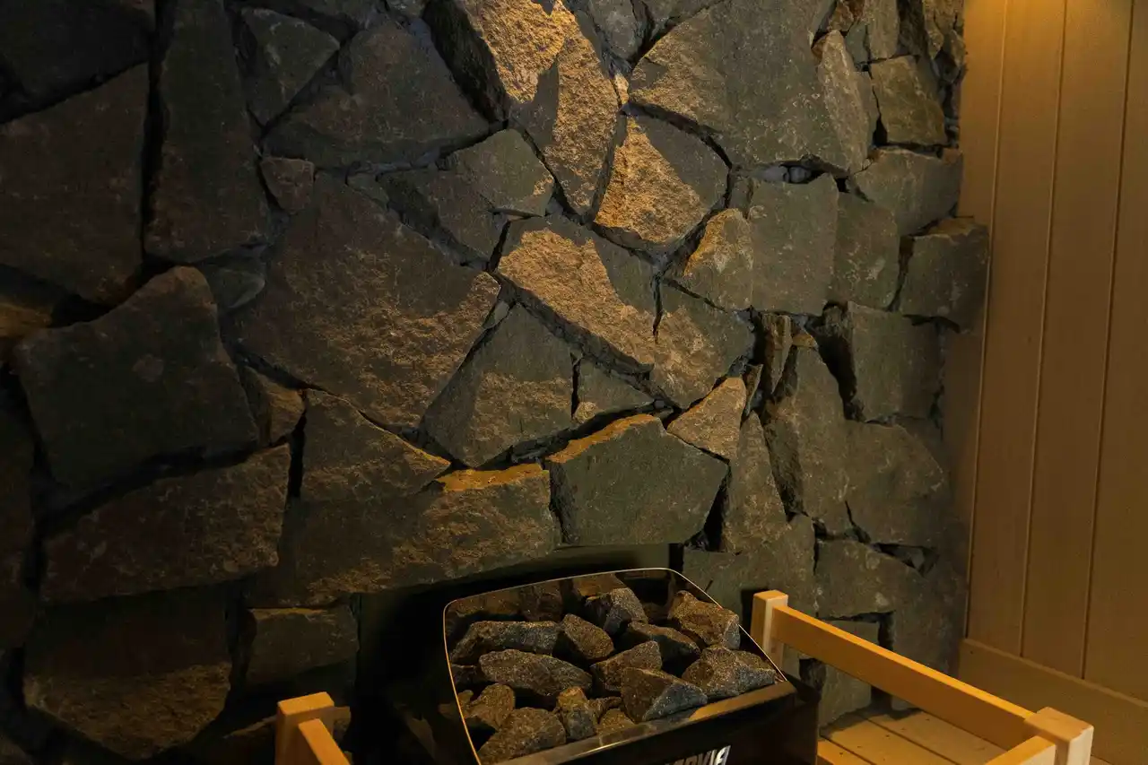 来待(きまち)地域で産出される「来待石」を壁面に設えた大森の湯オリジナルのサウナ。暑すぎず、心地よい温かさを感じるサウナ室で、セルフロウリュをお楽しみいただけます。 |