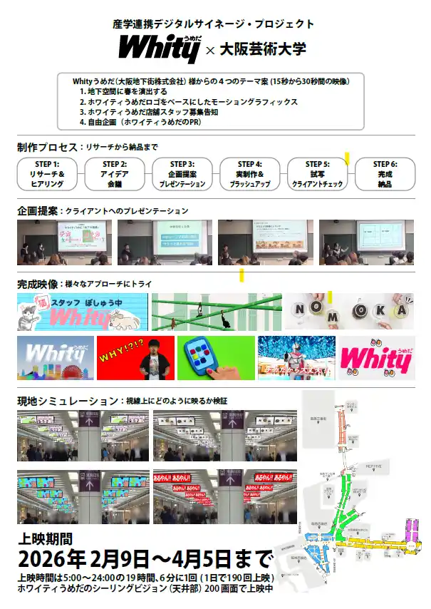 大阪芸術大学(所在地:大阪府南河内郡、学⾧:塚本 邦彦、以下本学)は、大阪地下街株式会社と協働し、1日約40万人が通行する「ホワイティうめだ」の200面デジタルサイネージを活用したPR映像制作プロジェクトを実施しました。本プロジェクトは、映像学科の学生たちが「リアルなクライアントワーク」を体験する実践的な取り組みであり、制作された16チームの映像作品は、ホワイティうめだにて2026年4月5日(日)まで放映しています。 |