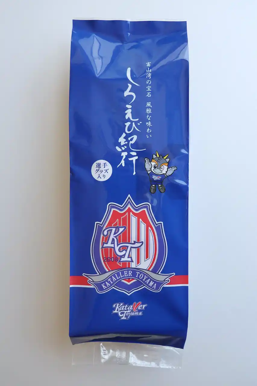 チームカラーのブルーとレッドが目を惹く、カターレ富山オリジナルパッケージのしろえび紀行です。 |