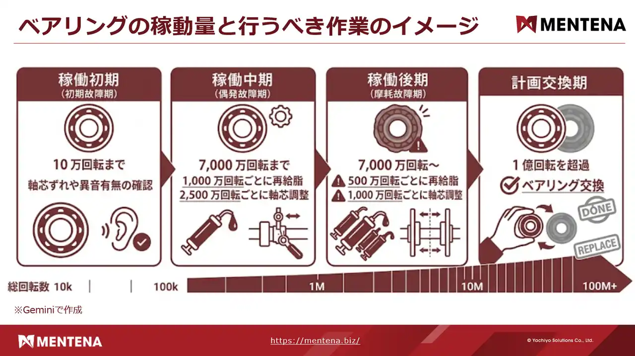 1.モーターやベアリングなどの駆動系の回転数を蓄積し、所定回転数ごとに調整や給脂・消耗品交換を行う |