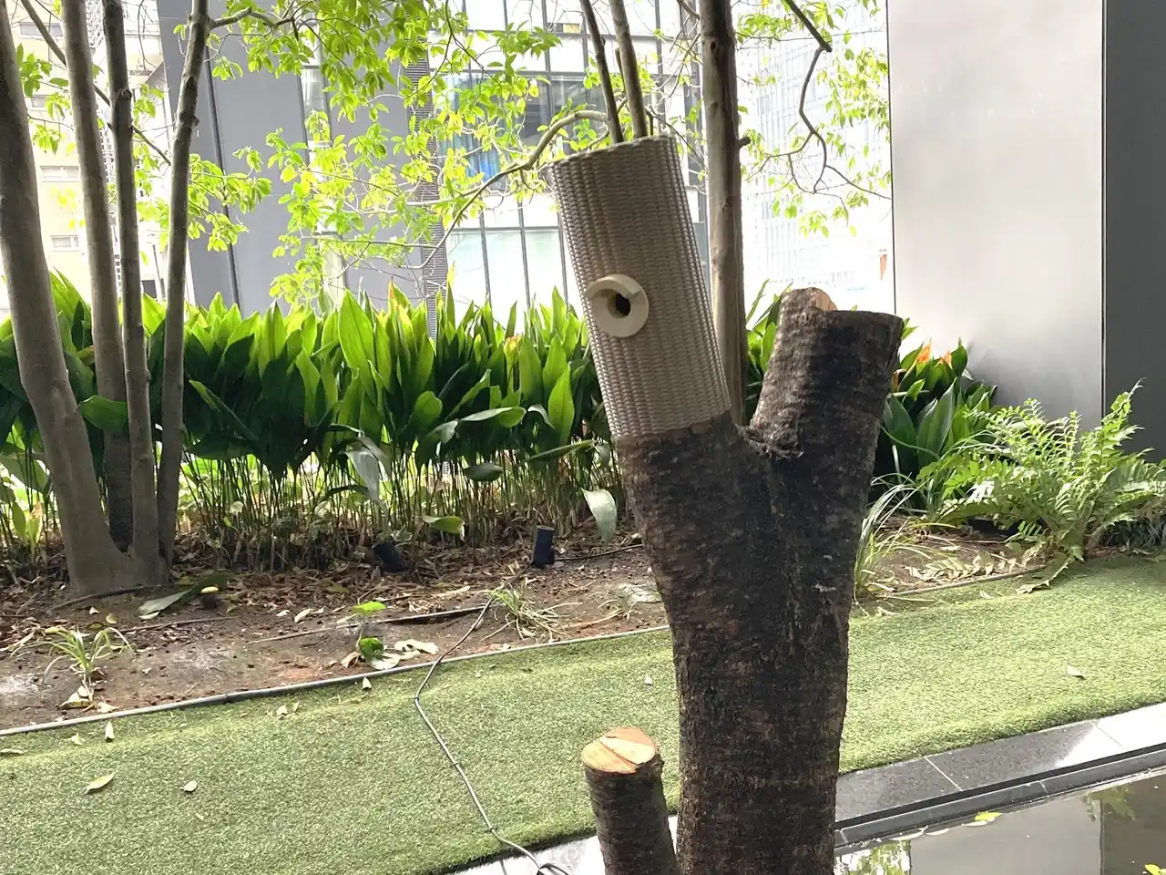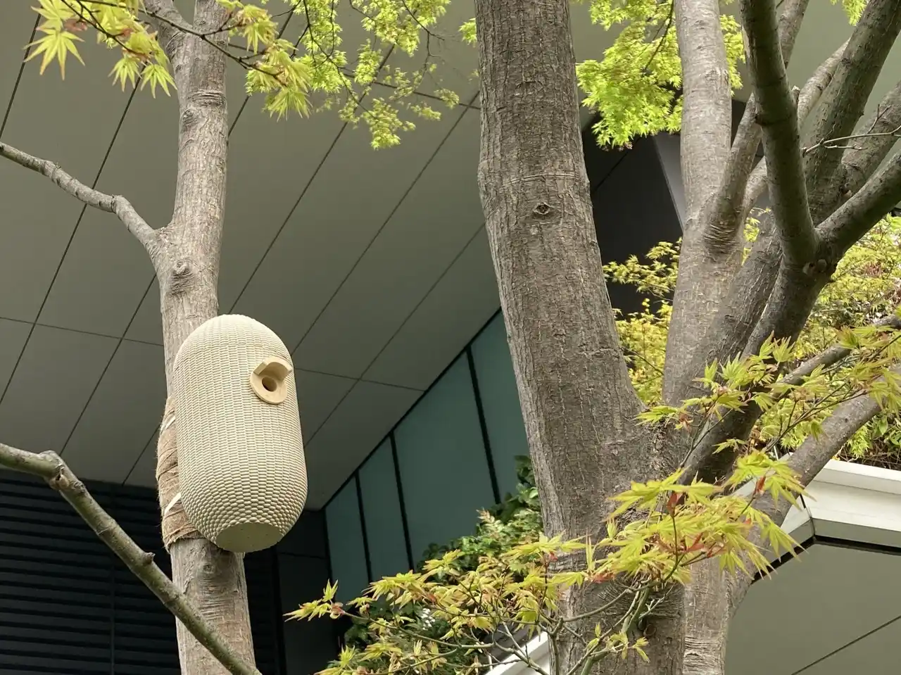 大手町タワーの敷地の約3分の1に広がる緑地「大手町の森」から切り出された剪定丸太を生かし、まるで木そのものが自然に成長して形作られたかのような巣箱です。周囲の木々と完全に一体化して風景に溶け込むことで、外敵の目から小鳥たちを安全に守るカモフラージュの役割も果たしています。 |