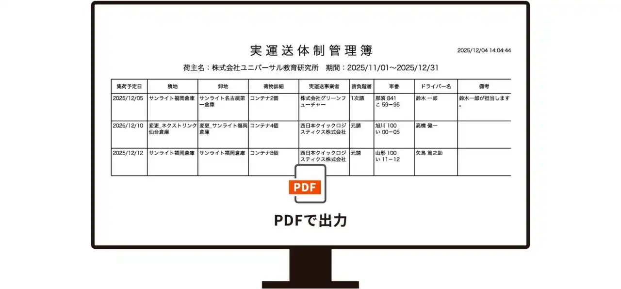 車両・ドライバー・下請け階層などの情報を一覧で可視化できるほか、PDF出力にも対応しており、説明資料の作成もスムーズに行えます。 |