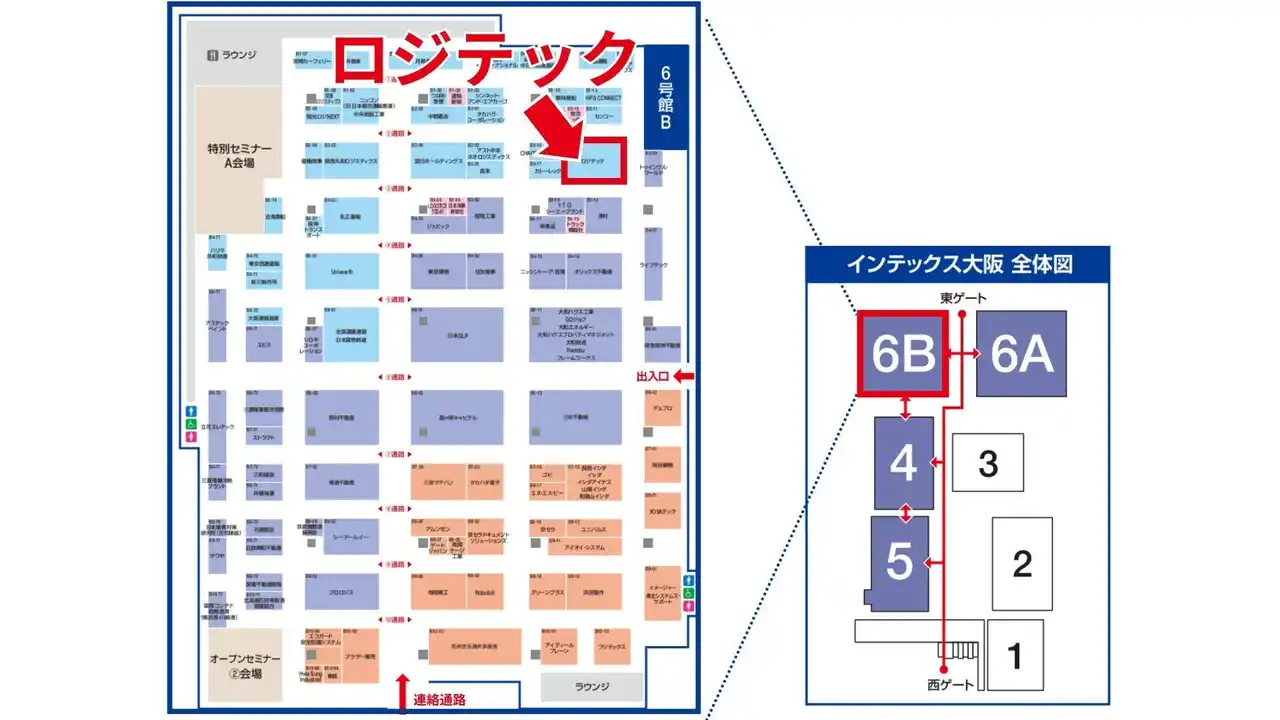 ロジテックブースは6号館B 出入口右手方向に位置しています。物流に関する課題をお持ちの方は、ぜひお立ち寄りください。 |