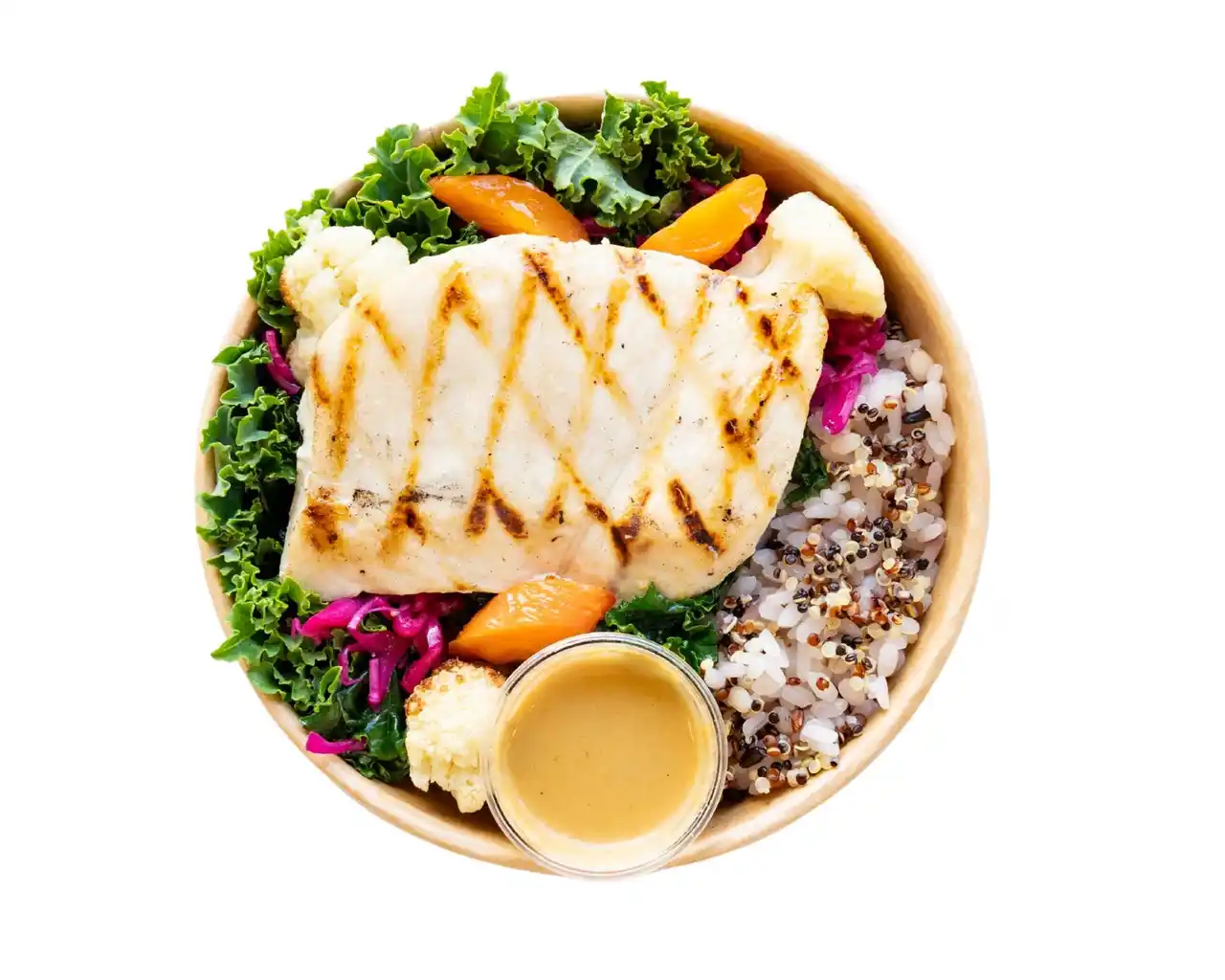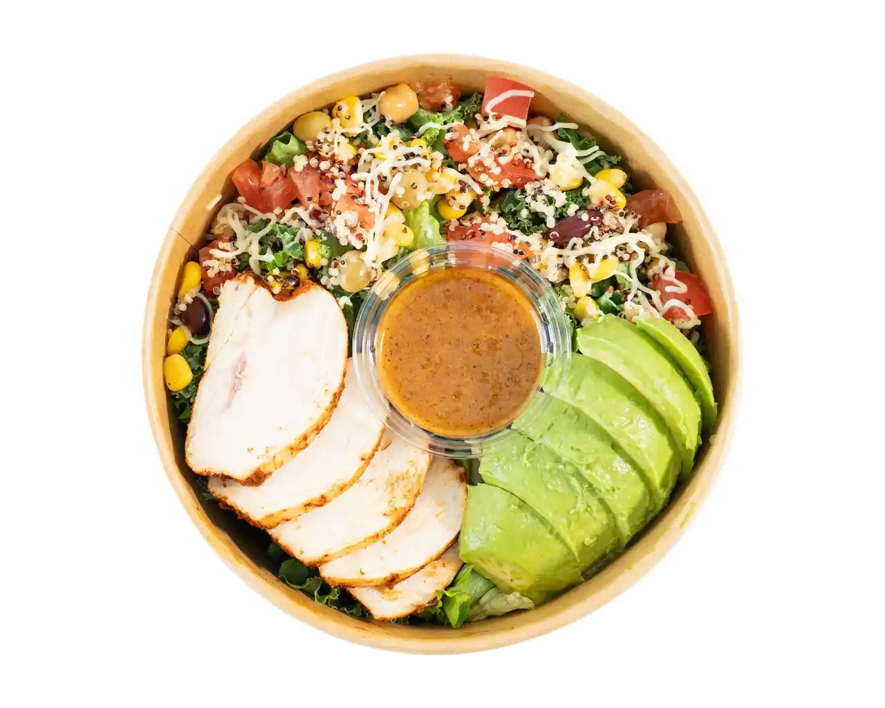 ケイジャンスパイスを効かせ香ばしくグリルしたチキンに、アボカドをトッピング。キヌア、トウモロコシ、トマト、ケール、レタス、チーズなど色鮮やかな食材をバランスよく組み合わせた人気のサラダです。スパイスの効いたコクのあるドレッシングが食材の旨みを引き立て、食欲をそそる味わいに仕上げました。 |