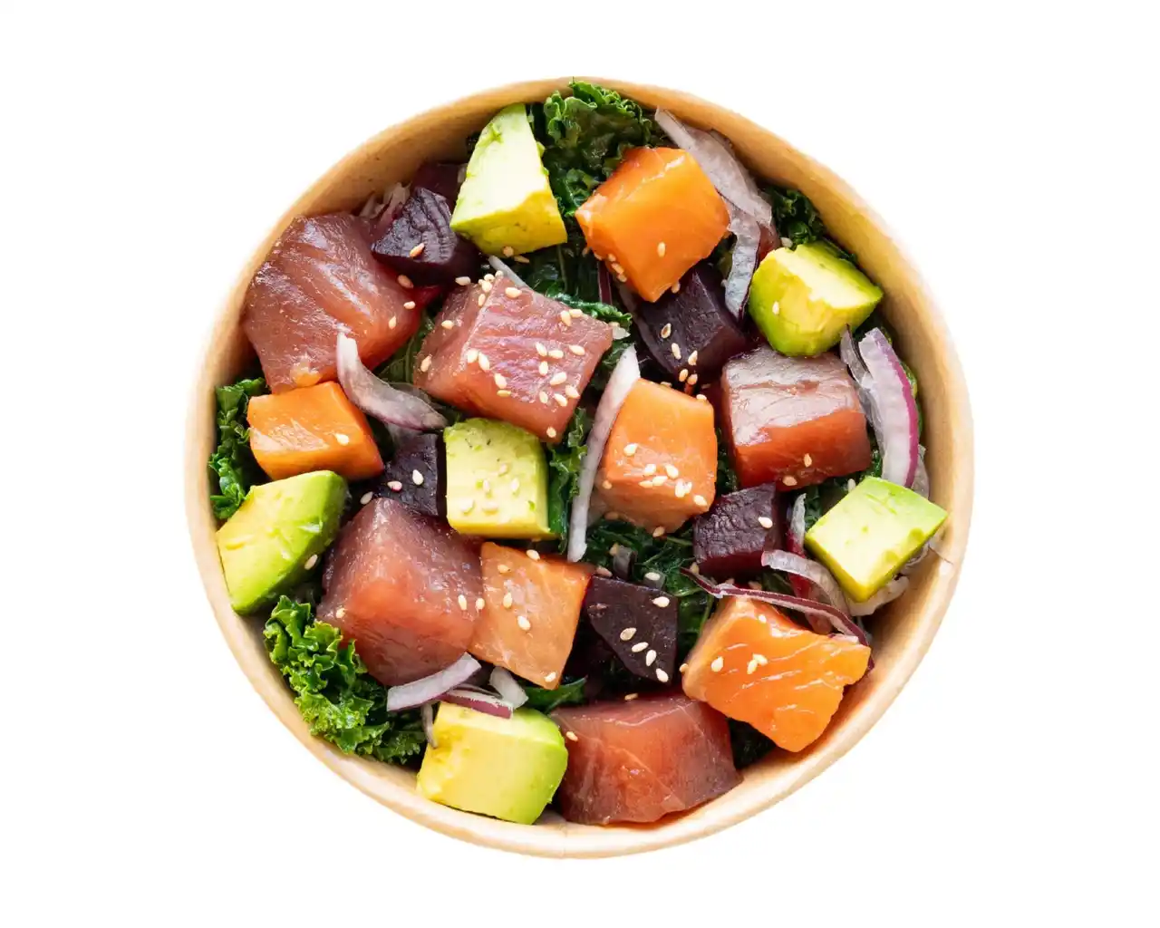 1個 ¥1,728(税込) ハワイのポキ丼から着想を得たライスボウル。白米に十五穀米を混ぜて炊き上げたご飯をベースに、マグロとサーモンのポキは牡蠣醤油の特製ダレで漬け込み、海鮮の旨みを引き立てました。自社農園で育てたケールやビーツなどの西洋野菜とクリーミーなアボカドを合わせたひと口ごとに素材の旨みと彩りのバランスが楽しめるワンボウルです。 |
