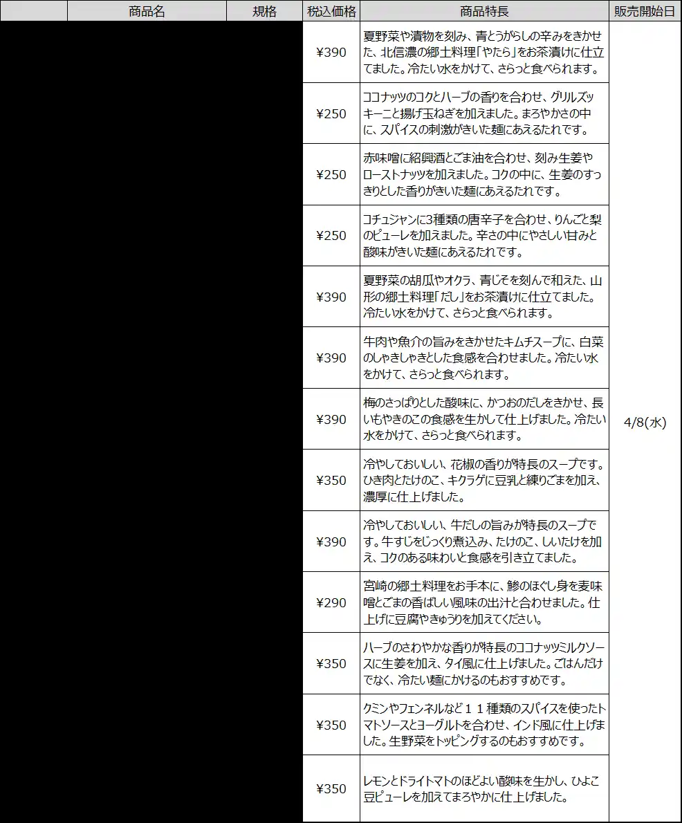 良品計画は、「感じ良い暮らしと社会」の実現に向けて、「簡素が豪華に引け目を感じることのない価値観」をもとに、日常の暮らしを整え、豊かにすることを目指し、商品やサービスを提供しています。夏の暑さが年々厳しさを増す中でも、食を通じて季節を楽しみ、食欲のない時でも手軽に食事ができる商品として「冷やし茶漬け」シリーズや「麺にあえる」シリーズ、定番の「ごはんにかける 冷やし」シリーズ、「冷やして食べるカレー」シリーズなどを季節限定で発売します。 |