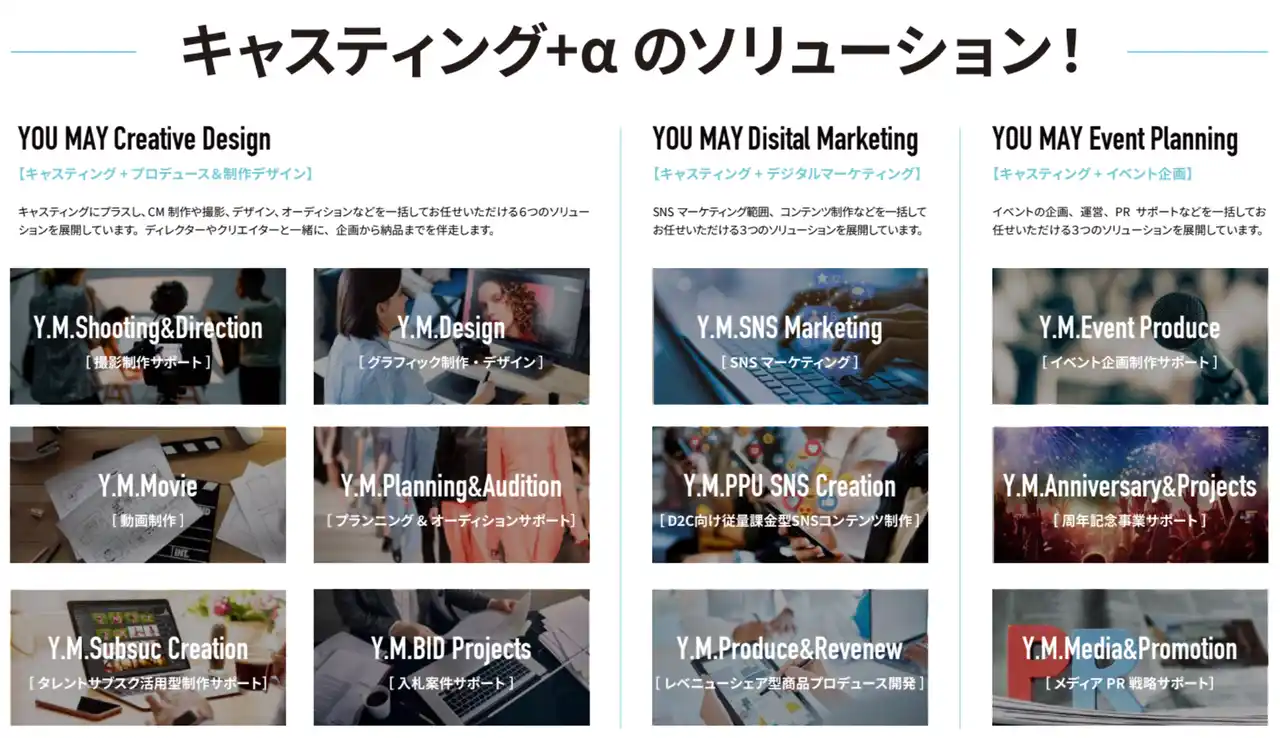 | YOU MAY Castingではキャスティングを主軸に[プロデュース&制作デザイン][デジタルマーケティング][イベント企画]の大きく3カテゴリ、12のソリューションを提供しています。 | |||