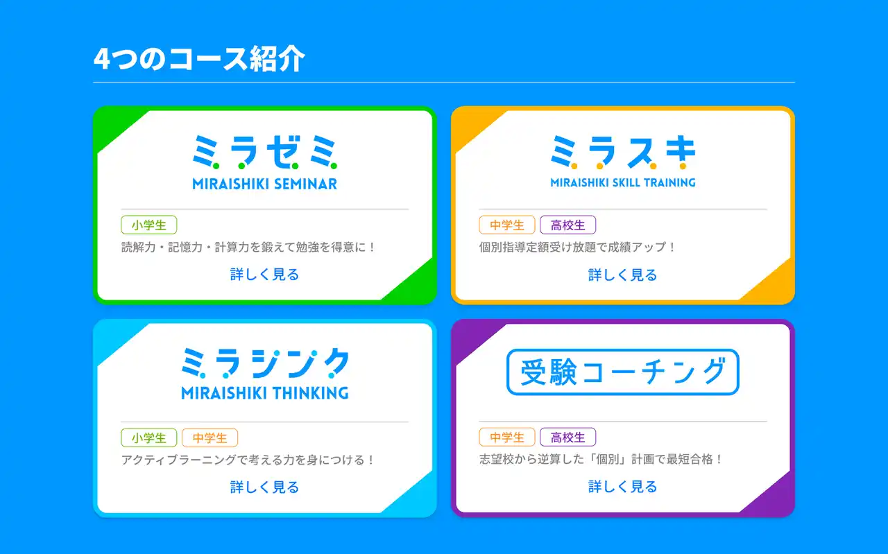 | 「ミラ+○○」という統一された命名規則により、ミライ式ブランドの一体感を保ちながら、各コースの目的を直感的に伝えるネーミングとしました。 | ||||