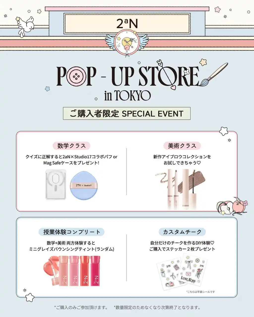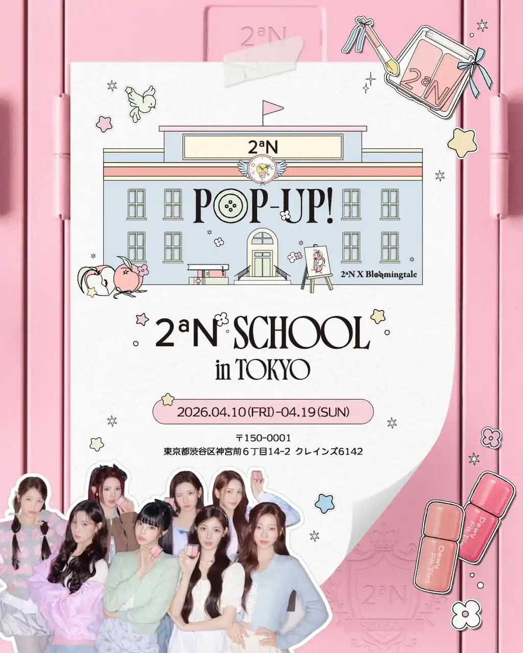 | 韓国発のメイクアップブランド「2aN(トゥーエーエヌ)」の日本総代理店であるWONDER LINE株式会社(本社:東京都渋谷区)は、「Love Rosy Collection(ラブロージーコレクション)」の発売を記念し、2026年4月10日(金)から4月19日(日)までの期間、東京・表参道にて体験型POPUPイベント『2aN SCHOOL IN TOKYO』を開催いたします。 | |||||||||