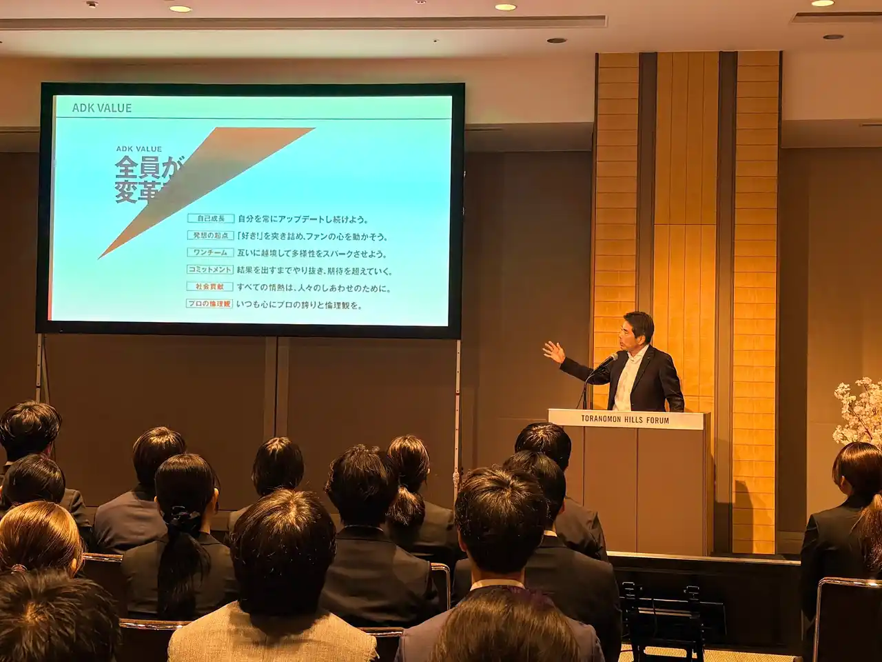 式典では、代表取締役社長 CEOの大山俊哉が登壇。創業70年を迎え、常に変革を続けてきたADKの歩みを振り返りつつ、「AIが答えを出す時代だからこそ、問いを立て、人の心を動かす『意志』が重要になる。常に新しい領域に挑み続けることこそが私たちの存在意義である」と新入社員に向けて祝辞を贈りました。 |