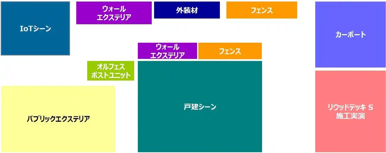 フェアのテーマは“建物と外構のトータルコーディネイト提案”。シンプル、フラットで住宅との一体感を演出するカーポートやポストユニットを中心に、新木調色や新商品を採用したトレンドを取り入れた戸建シーンを紹介。シーンの中央には巨大な大屋根のように一体感のある新型「プレーンルーフ」と、スクエアなフォルムと洗練されたディテールが特長の新型ポストユニットを展示。施工実演コーナーでは「リウッドデッキS」を扱い、施工時間の大幅な短縮や同梱の治具を用いて施工性の良さをご案内します。