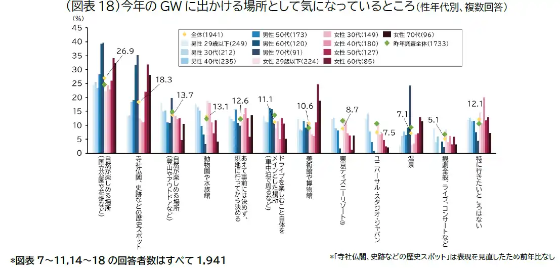 出かける場所として気になっているところ:「自然が楽しめる場所(国立公園や花畑など)(26.9%)」が最も多く、次いで「寺社仏閣、史跡などの歴史スポット(18.3%)」、「自然が楽しめる場所(登山やアウトドアなど)(13.7%)」となりました(図表18)。 |