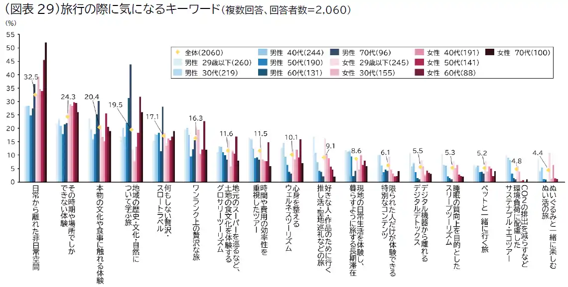 性年代別にみると、男女60代・70代では「地域の歴史・文化・自然について学ぶ旅」が高く、男女29歳以下では「好きな人・作品のために行く推し活・聖地巡礼などの旅」をはじめ、「デジタル機器から離れるデジタルデトックス」、「睡眠の質向上を目的としたスリープツーリズム」、「ぬいぐるみと一緒に楽しむぬい活の旅」など、趣味性や自己回復、SNSと親和性の高いキーワードが上位に挙がりました。旅行に求める価値は世代によって異なり、旅行が従来の観光だけでなく、生活者の関心に応じた体験へと多様に広がりつつあるといえそうです(図表29)。 |