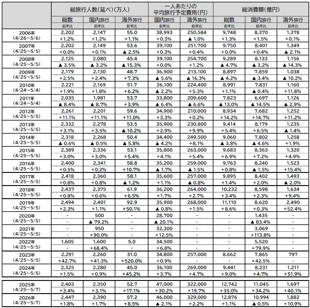 JTBは、「ゴールデンウィーク(以下、GW)<2026年4月25日~5月7日>に、1泊以上の旅行に出かける人」の旅行動向見通しをまとめました。本レポートは、JTBグループが実施したアンケート調査に加え、各種経済動向、業界動向、運輸・観光関連データ、宿泊施設の予約状況、各種意識調査などをもとに推計したもので、1969年より継続的に調査を実施しています。 |