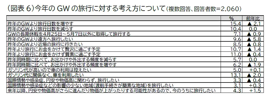 GWに旅行へ行くと答えた本調査対象者2,060人に対して、今年のGWの旅行に対する考え方を聞きました。旅行先については、「昨年のGWより遠方へ旅行したい(9.6%)」が前年よりも5.8ポイント減少し、「昨年のGWより近場の旅行に行きたい(8.5%)」の減少幅(0.8ポイント)を大きく上回りました。また「昨年より旅行にお金をかけて贅沢に過ごす予定(10.7%)」は1.4ポイント減少し、「昨年より旅行にお金をかけず質素に過ごす予定(11.0%)」を下回りました。そのほか日数や頻度についても「増やす」と回答した割合は減少傾向にあります。ガソリンについては、「ガソリン代に関係なく、車を利用したい(13.1%)」は2.0ポイント減少しました。 |