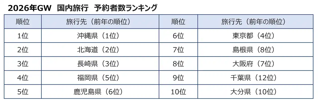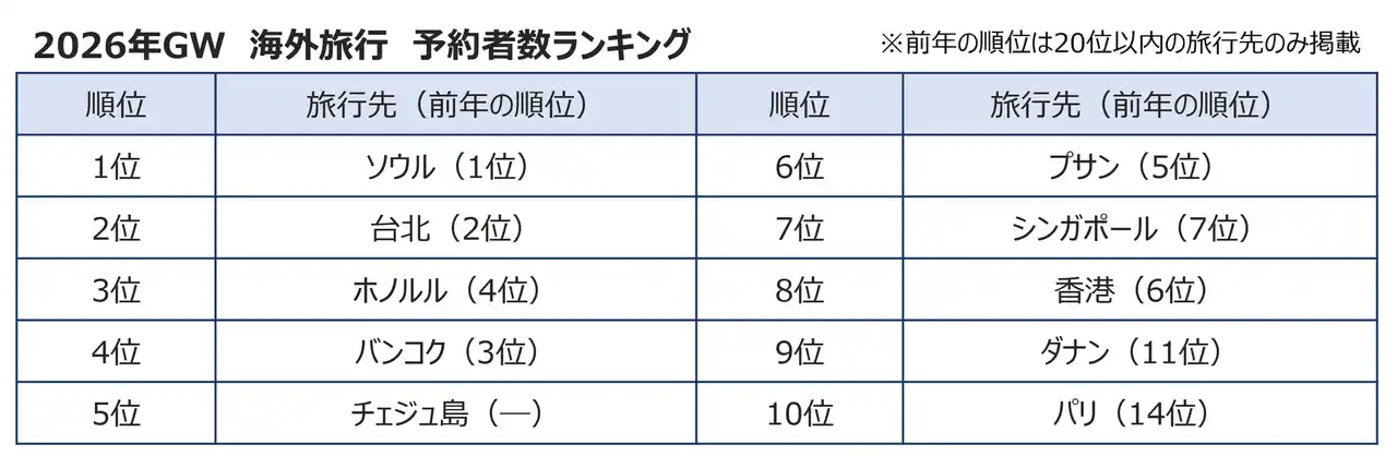 株式会社エイチ・アイ・エス(本社:東京都新宿区 以下、HIS)は、ゴールデンウィーク(2026年4月24日~5月6日、以下GW)の予約状況から、旅行動向について下記のとおりにまとめました。 |