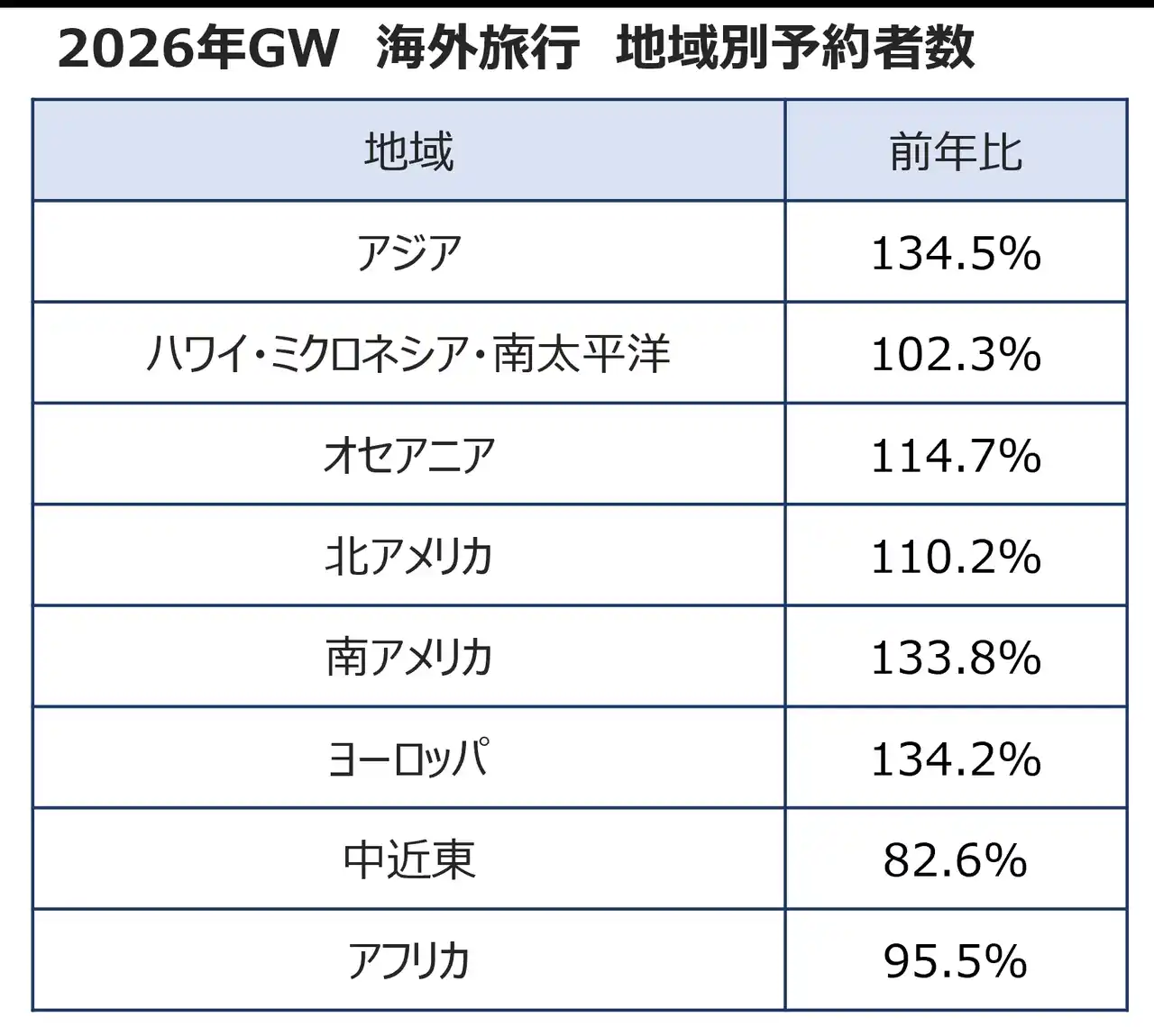 また、長距離路線も好調で、ヨーロッパ地域は前年比134.2%となりました。一方で、中近東地域は前年割れの82.6%となっています。前年のGW時期における中近東地域の予約者数は、全体に占める割合としては3.6%と大きなシェアではない地域ではあったものの、今後の動向は注視する必要があると考えております。 |