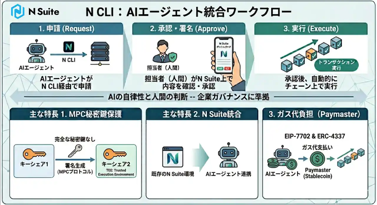 「N Suite」が提供する「申請→承認・署名→実行」のトランザクション管理フローは、すでに多くの企業のブロックチェーン運用に導入されています。「N CLI」は、このフローにAIエージェントからのアクセスを追加するインターフェースであり、既存の「N Suite」環境にシームレスに統合できます。 |