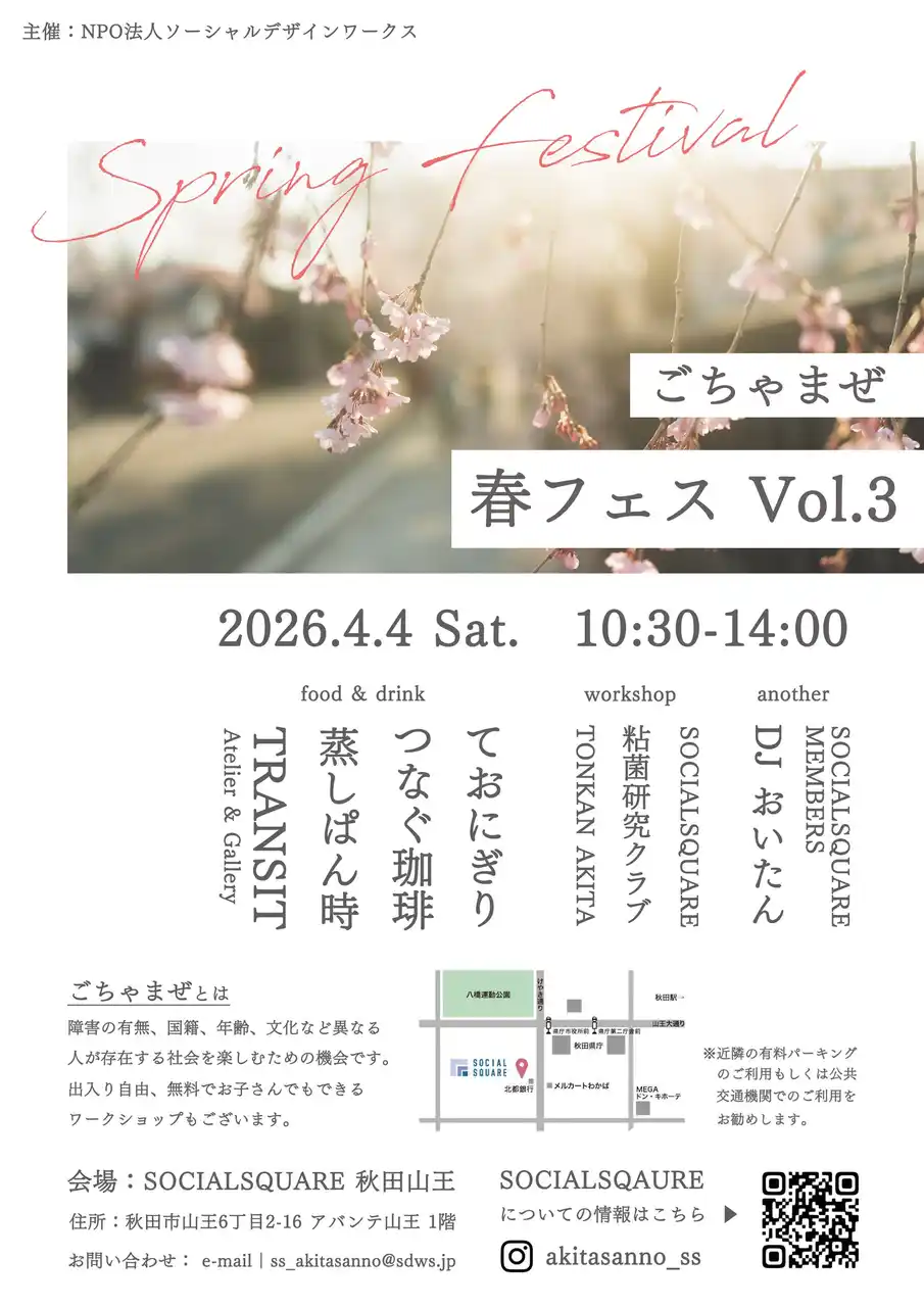特定非営利活動法人ソーシャルデザインワークス(本部所在地:福島県いわき市、代表:北山剛)が運営する障害福祉事業所「SOCIALSQUARE 秋田山王店」(秋田県秋田市)は、開所3周年を記念し、2026年4月4日(土)に地域交流イベント「ごちゃまぜ春フェス Vol.3」を開催します。 |