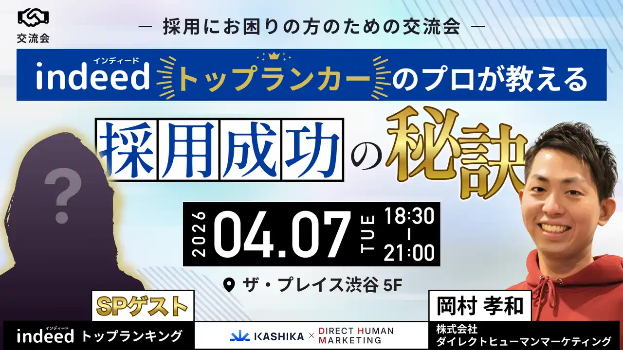 株式会社KASHIKAは、採用活動にお悩みの企業様・人事担当者様を対象としたリアルイベント『Indeedトップランカーのプロが教える「採用成功の秘訣」&交流会』を、東京・渋谷にて開催いたします。