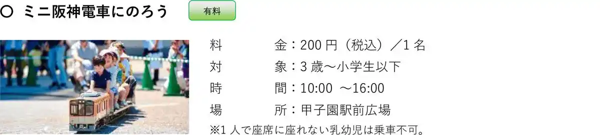 また、大人気の警察・消防車両や、グラウンド整備車両と記念撮影が行える実車展示のほか、オリジナル記念乗車証がもらえる「ミニ阪神電車」の乗車体験が出展します。 |